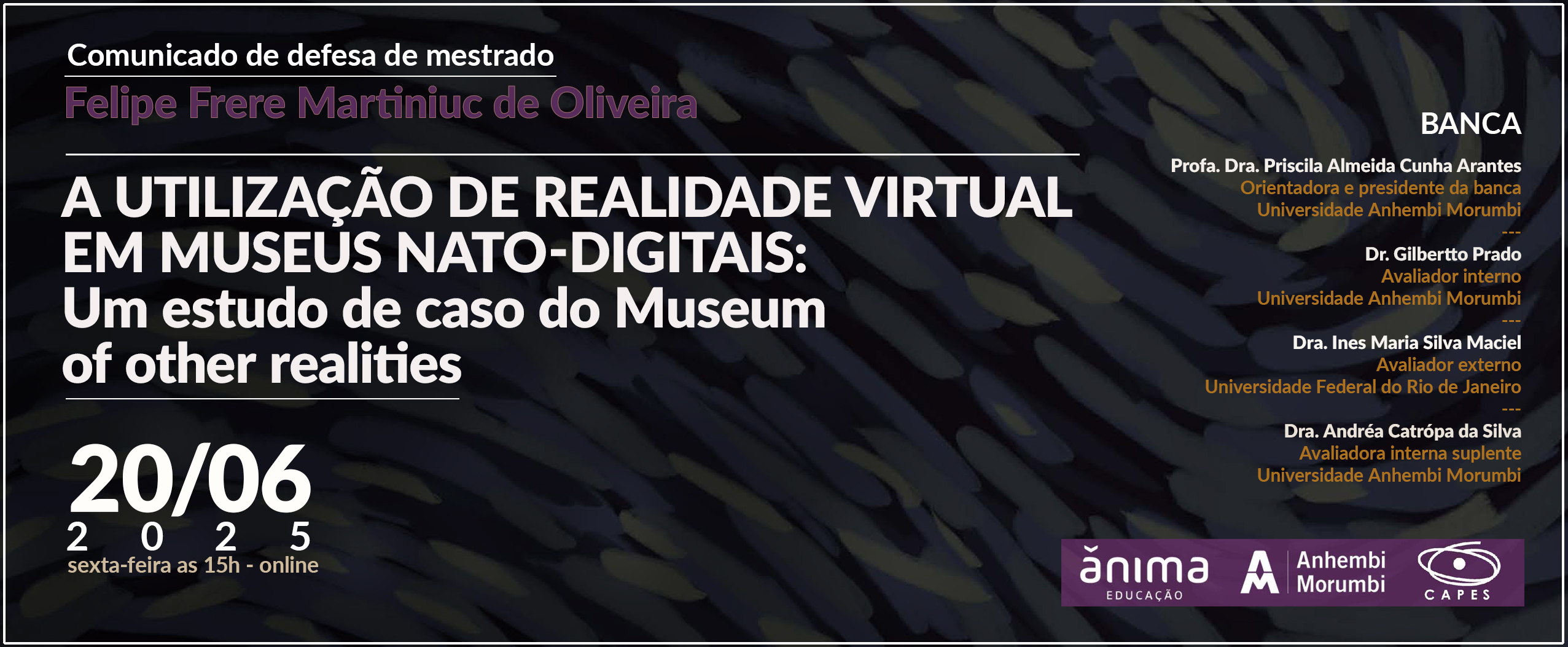Banca de defesa: A utilização de realidade virtual em museus nato-digitais: Um estudo de caso do Museum of other realities BANCA DE DEFESA | Mestrado em Design O PPG Design da Universidade Anhembi Morumbi convida para a defesa da Dissertação de Mestrado em Design, A utilização de realidade virtual em museus nato-digitais: Um estudo de caso do Museum of other realities por ELIPE FRERE MARTINIUC DE OLIVEIRA, que ocorrerá dia 20/06/2025 às 15h. O evento será por meio online. Orientadora: Profa. Dra. Priscila Almeida Cunha Arantes. FELIPE FRERE MARTINIUC DE OLIVEIRA 20.06.2025 | 15H00 | Sexta-feira [...]